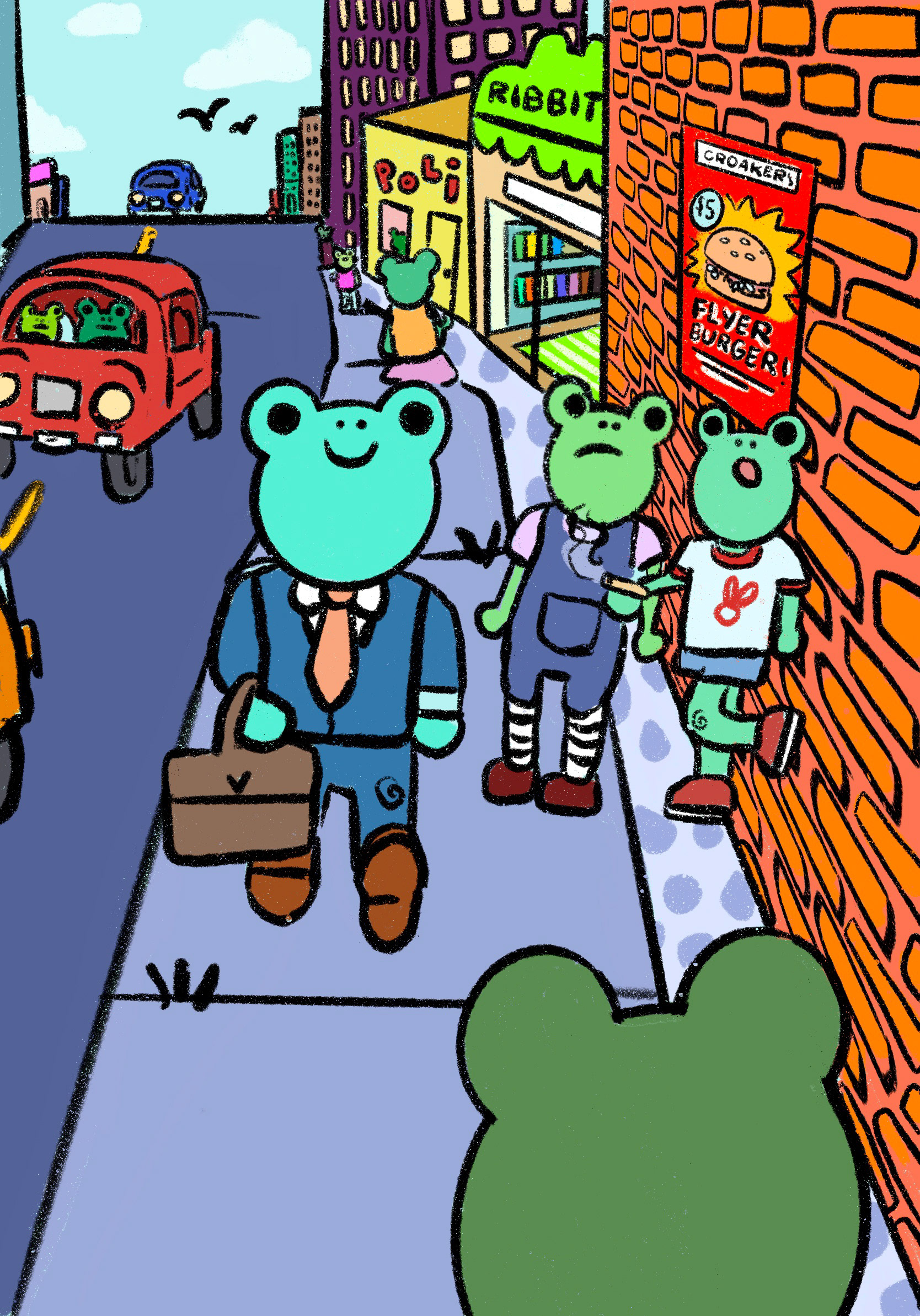 I was practicing drawing landscapes and I was inspired by the cities of Toronto and the everyday life of people in the city. So I wanted to turn the illustration into a frog version of the city.